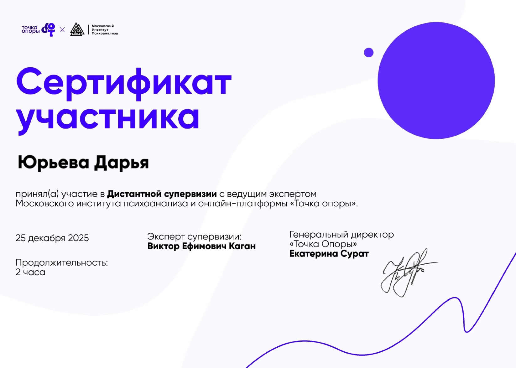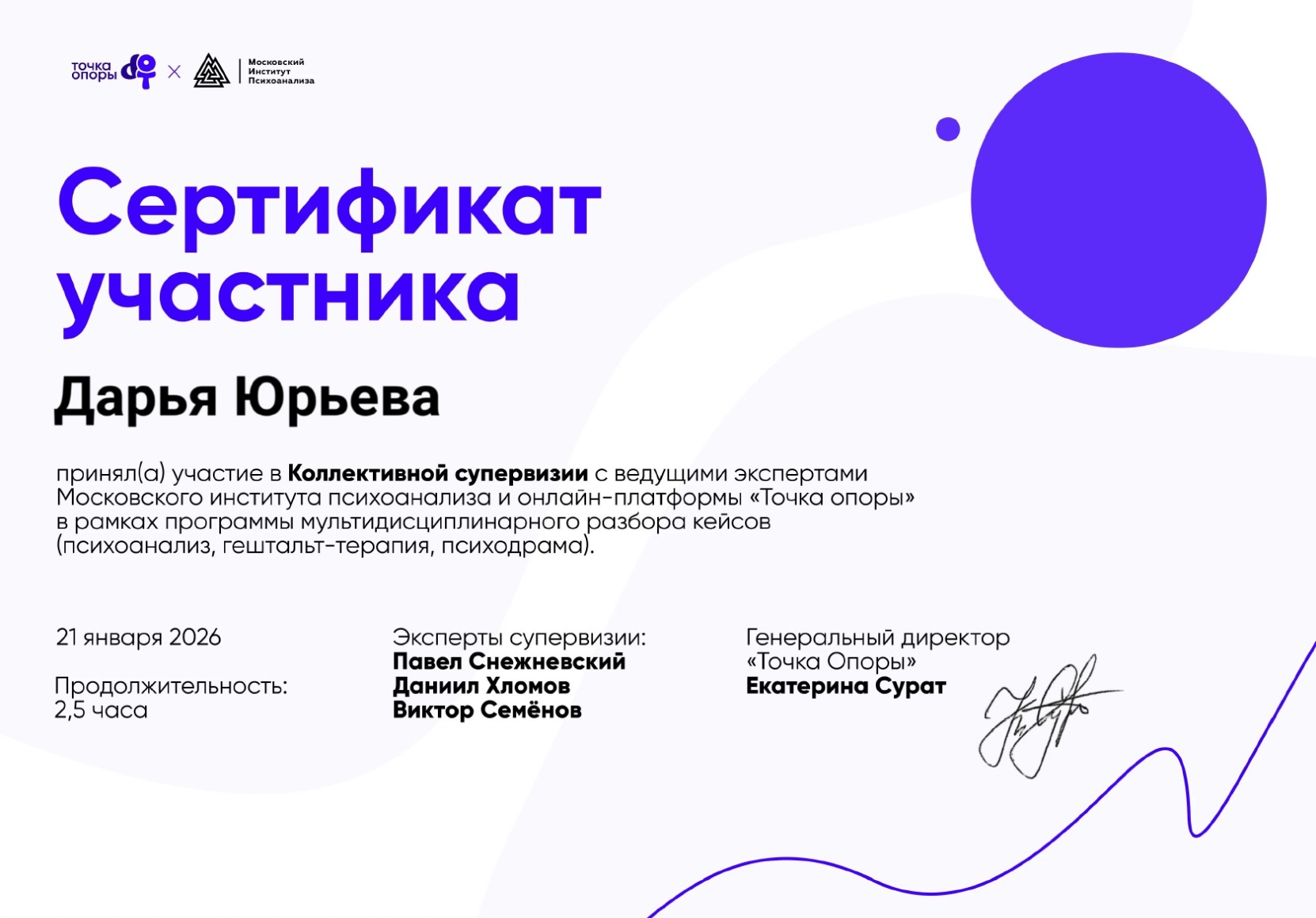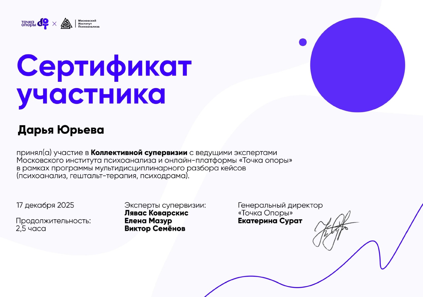 Обычно у меня 2-3 супервизора, которые работают в разных подходах. Прохожу супервизии и у специалистов из России, и у признанных во всем мире авторитетов психологии, психотерапии и психиатрии.