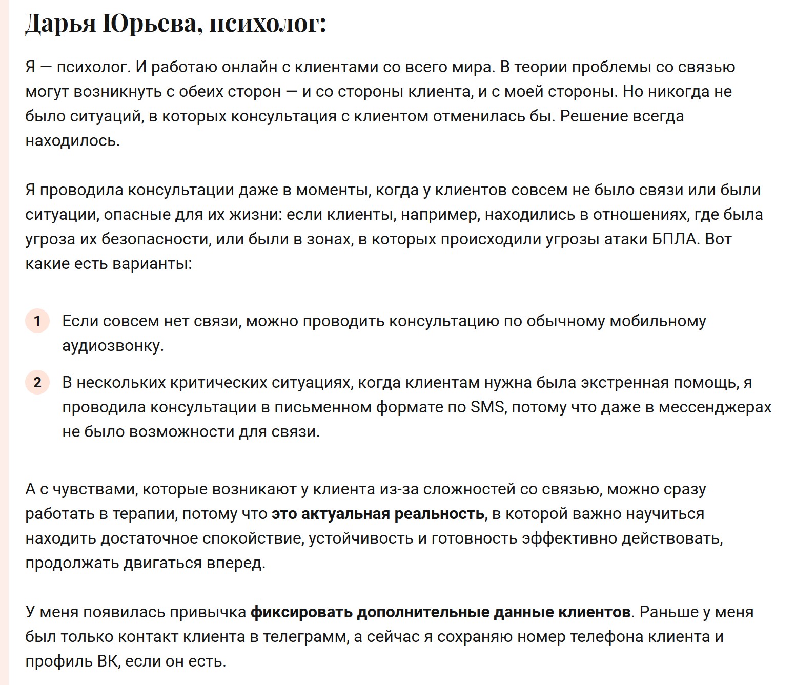 3. Если у вас будут перебои со связью или интернетом - найдем способы провести консультацию. Есть опыт проведения терапии в экстренных случаях: